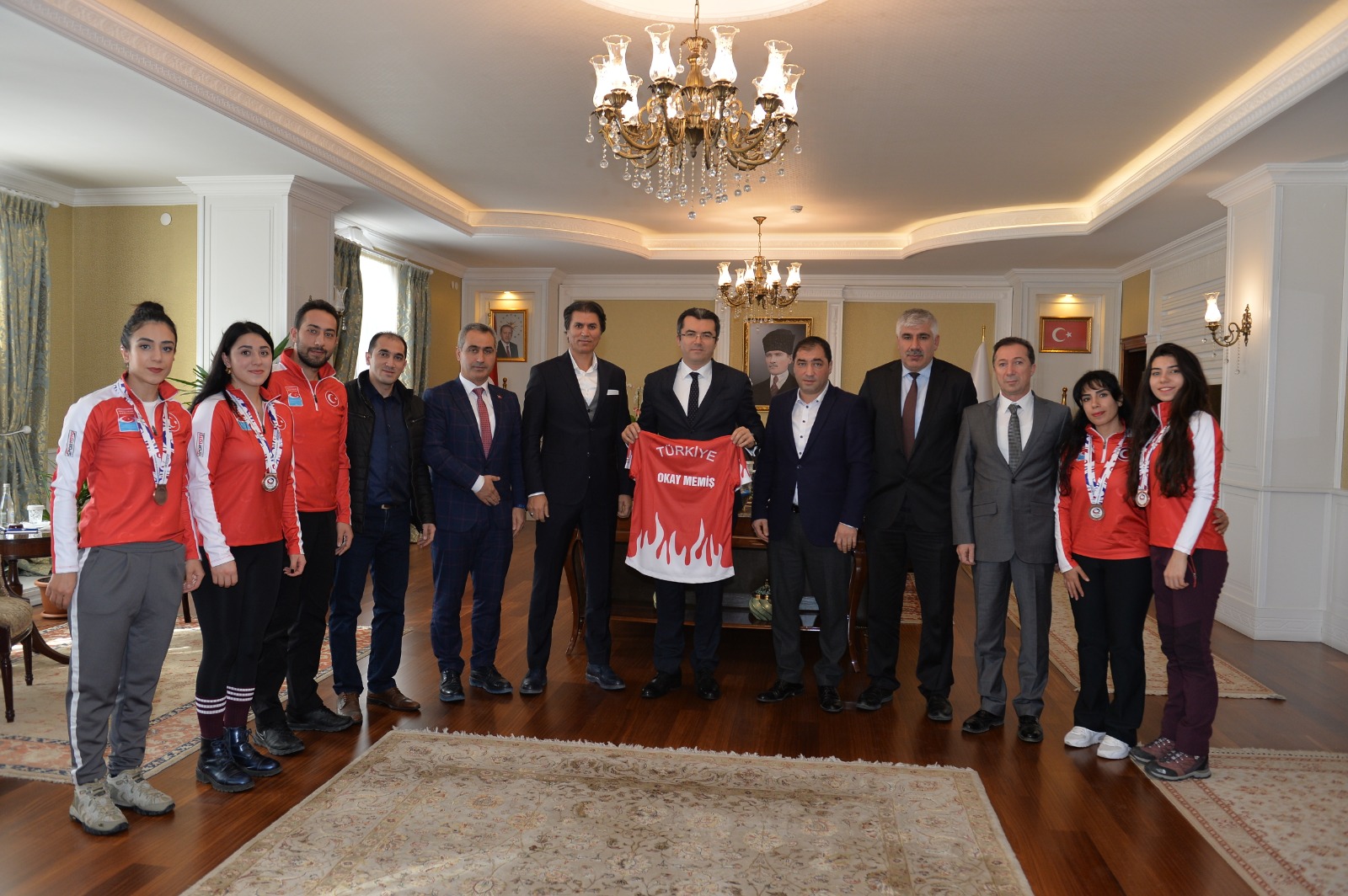 Haber 07/12/2018 Paylaş : Estonya'da yapılan Avrupa Curling Şampiyonasında 3’üncü olan Curling Kadın A Milli Takımı ve yöneticileri ile birlikte Vali Memiş’i makamında ziyaret etti. Ziyarete; Curling Federasyon Başkanı Kenan Şebin, Başkan vekili Ahmet Çelebi, Yönetim Kurulu üyeleri Murat Akın, Güngör Şenses, Erdal Karahan, Erzurum Curling İl Temsilcisi Resul Çelebi, Antrenör Sadık Topaloğlu, Sporcular; Öznur Polat, Dilşat Yıldız, Özlem Polat, Semiha Konuksever ve Beyzanur Konuksever katıldı. Ziyaretin ardından Curling A Takımı yönetici ve sporcuları Vali Okay Memiş’e Curling forması hediye ettiler.